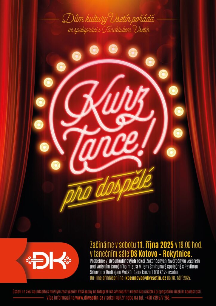 Přihlašování na taneční kurzy je možné pouze na email: kocunova@dkvsetin.cz, a to do 28. září 2025 nebo dle naplnění kurzu. Přihlašovat se můžete již nyní, v případě naplnění kurzu Vám podklady pro platbu budou zaslány 29. září 2025.